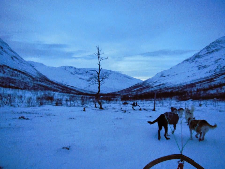 Felizmente deixaram a gente ir. E de verdade, foi uma das coisas mais legais que já fiz na vida! Depois de aproximadamente uma hora no bus de viagem vendo paisagens maravilhosas pelo caminho, chegamos na base da empresa, trocamos de roupa (tem que botar as roupas e botas especiais) e fomos aprender a controlar o nosso trenó. O guia vai na frente e atrás vão mais 3 trenós. São duas pessoas por trenó, uma controlando e uma sentada (e no meio do caminho tem a possibilidade de trocar). Primeiro eu fui sentada e o Ale controlando, quando chegou minha vez quase matei a gente numa árvore, mas deu tudo certo! hahahhhahahhah. Até tive uma "pequena" queda muito engraçada logo no início, quando o Ale foi desenrolar a patinha de um dos cachorros e eu fiquei segurando o trenó, ou tentando né.. os bichos eram tão fortes que meu peso não foi suficiente pra segurar o freio e eles saíram correndo e eu caí pra trás! hahahhahahahahah. O passeio em si demora uns 40 minutos mais ou menos, 20 pra cada um controlar. Todo o caminho é maravilhoso, os fiordes são sensacionais, os lagos congelados são incríveis, tudo inabitado! E ainda é ultramega divertido andar de trenó! O diferencial desse passeio foi que eles deixavam nós mesmo controlar os trenós, geralmente é um guia controlando e você vai só sentado (não que não seja legal, porque é muito divertido também, mas controlar é um diferencial ótimo).